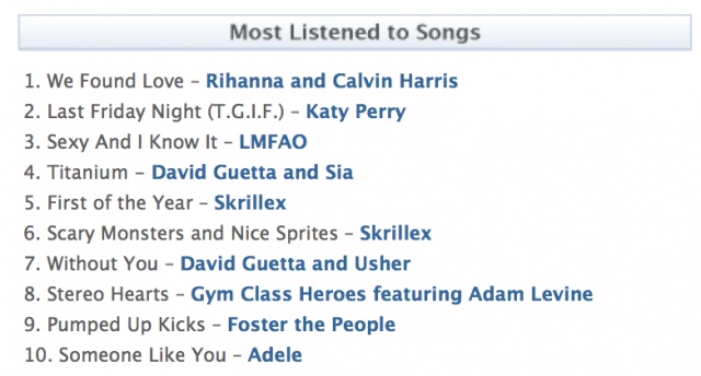 The top 6 fastest growing news outlets were: 1. CNN, 2. Fox News, 3. NPR, 4. The Onion, 5. The New York Times, and 6. Al Jezeera, showing the diversity of opinions and interests of Facebook’s user base. Rihanna’s “We Found Love” was the most listened to song. Facebook’s inclusion of song listening data underscores how its new Open Graph listening applications could become a way to accurately track song popularity beyond sales.