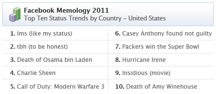 Facebook released a wealth of data about 2011′s most shared content, both globally and for specific countries. Across the world, Osama Bin Laden’s death was the most popular status update topic, followed by the Green Bay Packers’ Super Bowl win and the Casey Anthony trial.