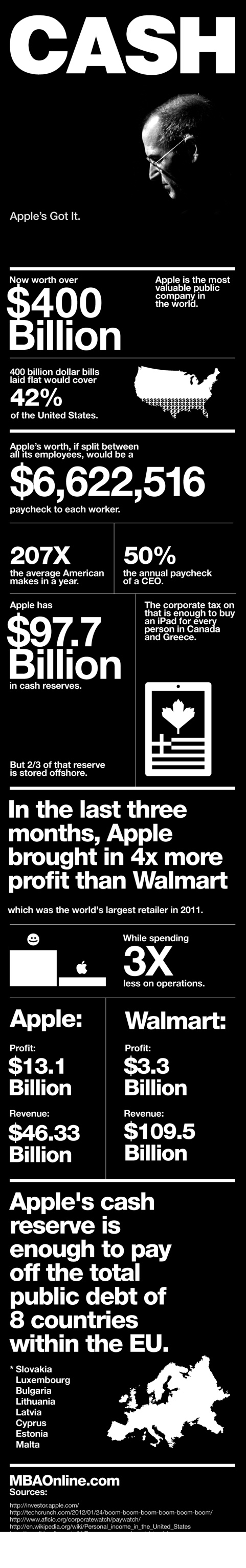 What would you do with $97 billion in cash? While we may never know, Apple is currently pondering that question. This graphic explores some unique comparisons to put the world’s most valuable public company into perspective. Perhaps more money doesn’t necessarily mean more problems. Enjoy!