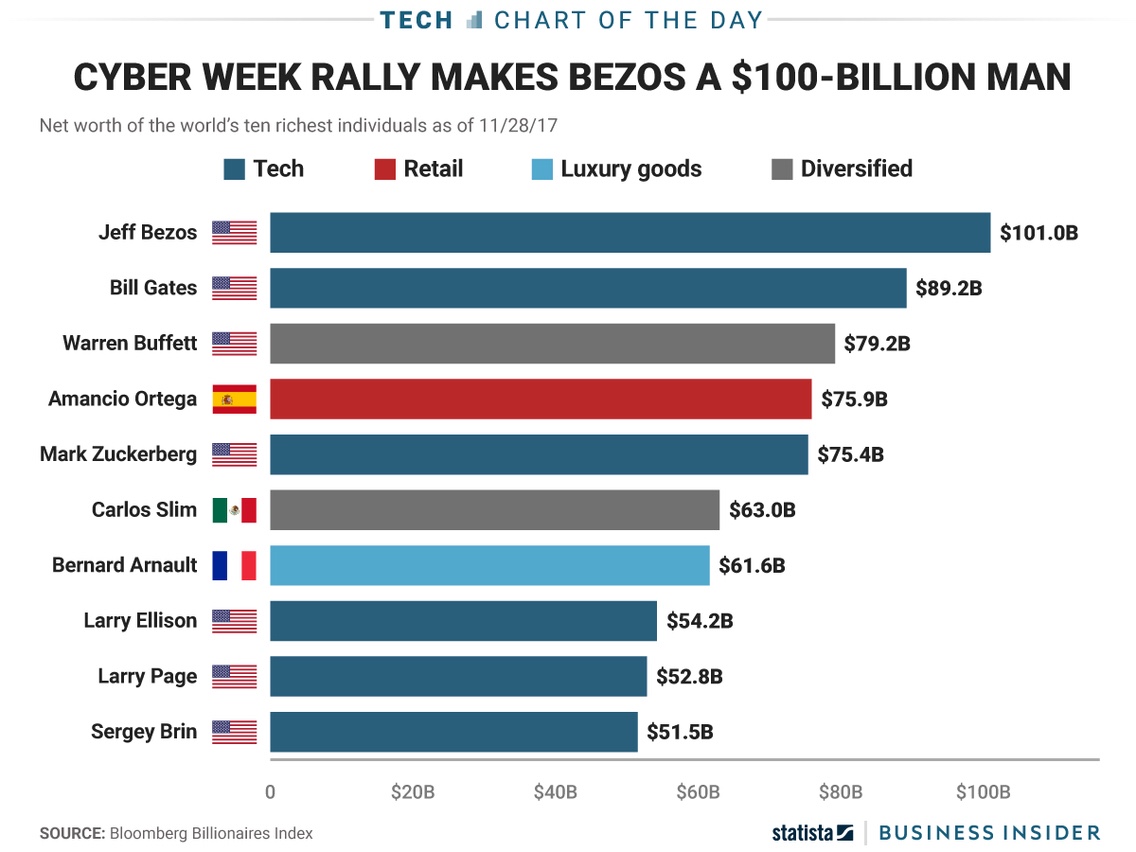 Jeff Bezos had a lot to be grateful for this Thanksgiving weekend. After record-breaking weekend sales, Amazon’s stock price hit an all-time high of $1,213.41 a share on Monday. That pushed Bezos’ net worth to over $100 billion, which is up 35% from the same period last year, according to Bloomberg.