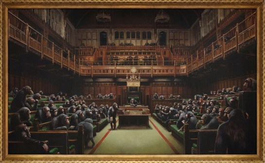 For the second year in a row, Banksy dominated the Sotheby’s Frieze Week evening sale of contemporary art in London. The secretive British artist’s massive piece of political satire, Devolved Parliament (2009), vaulted its high estimate of £2 million ($2.4 million) to eventually hammer down at £8.5 million ($10.4 million), or £9.8 million ($12.1 million) with fees, setting a new Banksy auction record. It tied with a large Jean-Michel Basquiat painting, Pyro (1984), for the night’s top price.