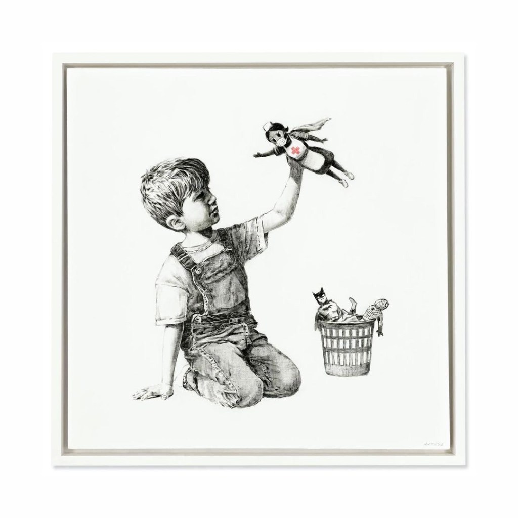 The work is a celebration of all the first responders helping with the COVID pandemic; the child has discarded his typical superhero figures to play with a uniformed, masked, and caped nurse.