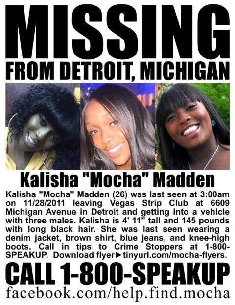 Kalisha Madden aka Mocha 26, mother of 6 was last seen leaving work Sunday night at the Vegas Strip Club (formerly the Sting) in Detroit on Michigan Ave, her family said.